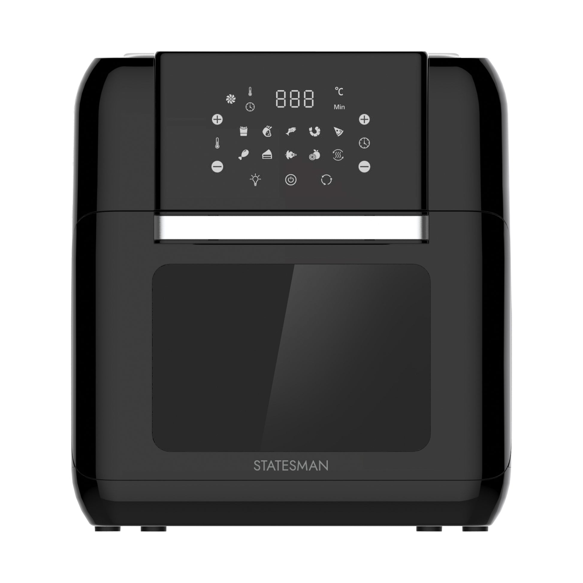 The Statesman 11 Litre 10-in-1 Digital Air Fry Oven features 10 pre-set cooking programs, including air fry, bake, roast, and dehydrate. It has a 90-minute timer and a viewing window with an interior light. Accessories include a rotisserie fork, rotating basket, skewer set, grill racks, and a drip tray, promoting energy-efficient, healthier cooking with 360° air circulation for faster, even results.