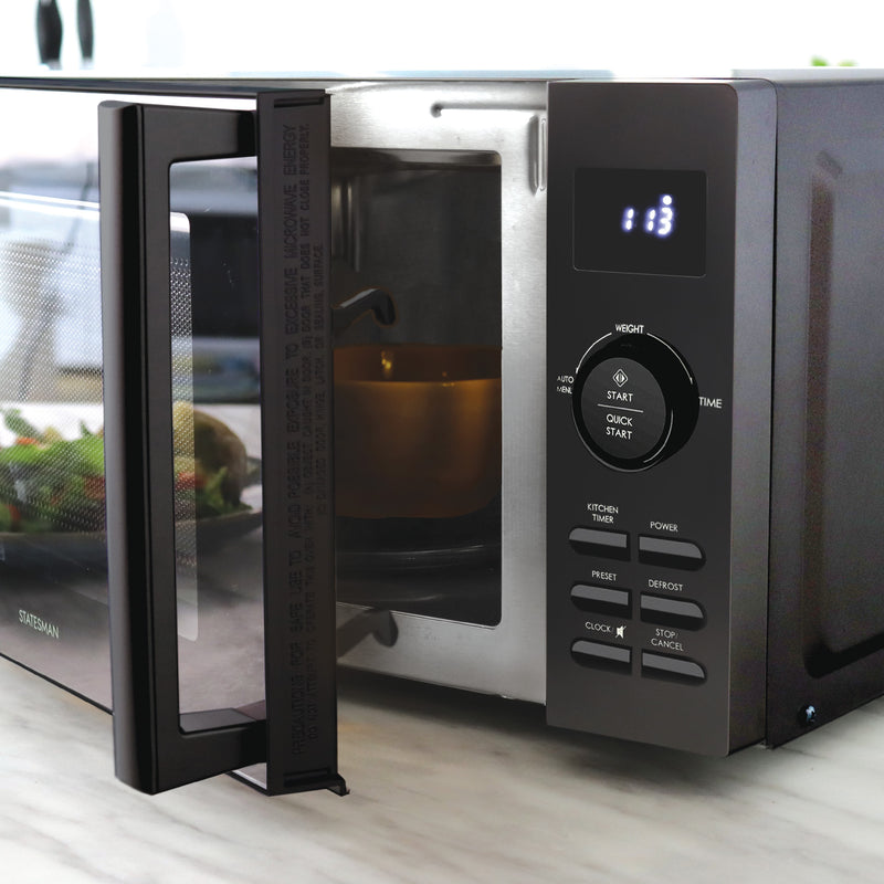 The Statesman 20 Litre Digital Solo Microwave is compact and feature-packed, available in sleek black or silver finishes. Its stainless steel cavity enhances cooking efficiency and durability. With 8 auto cooking programs, Quick Start, 11 power levels, and a 95-minute timer, it ensures customised cooking. Additional features include defrost options, an LED display, and a mute function.