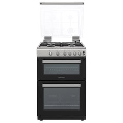 Glass Lid Double Oven Gas Cooker, 4 Gas Burners, 60cm Wide, Silver