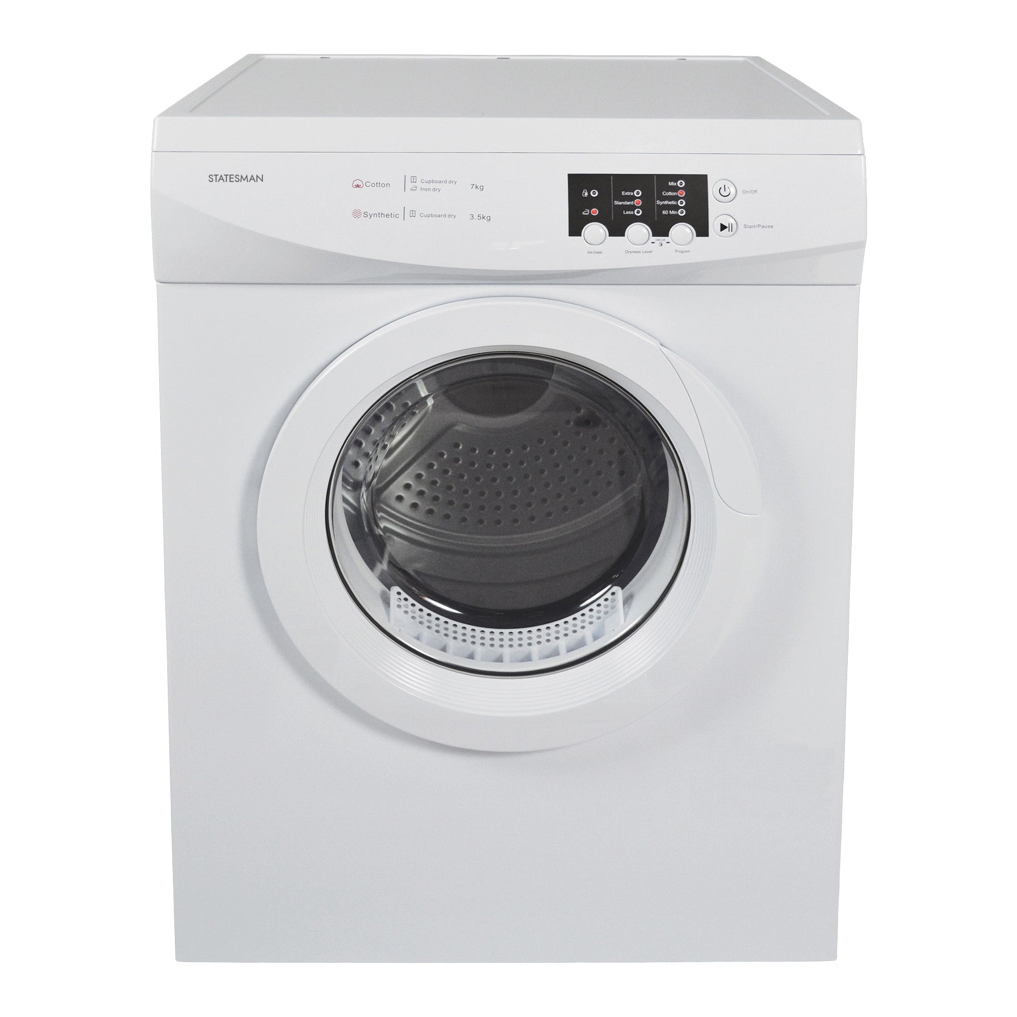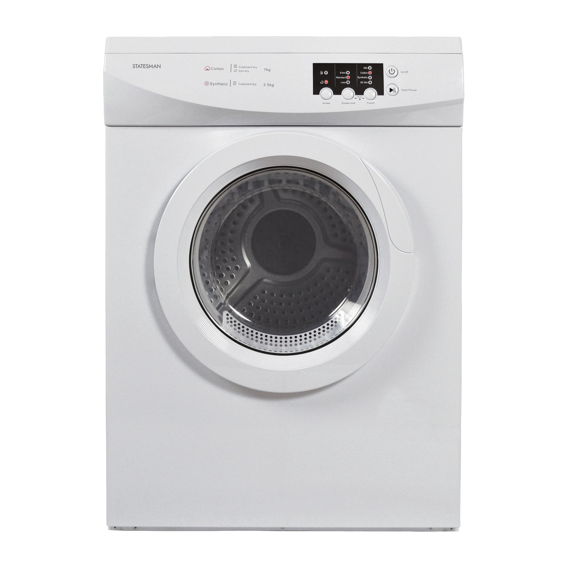 The Statesman TVM07W is a free-standing tumble dryer with a generous 7 kg load capacity, designed for easy loading and unloading thanks to its wide-open door. Featuring a range of time-saving options, this dryer boasts an energy rating of C and eliminates the hassle of emptying a water reservoir.